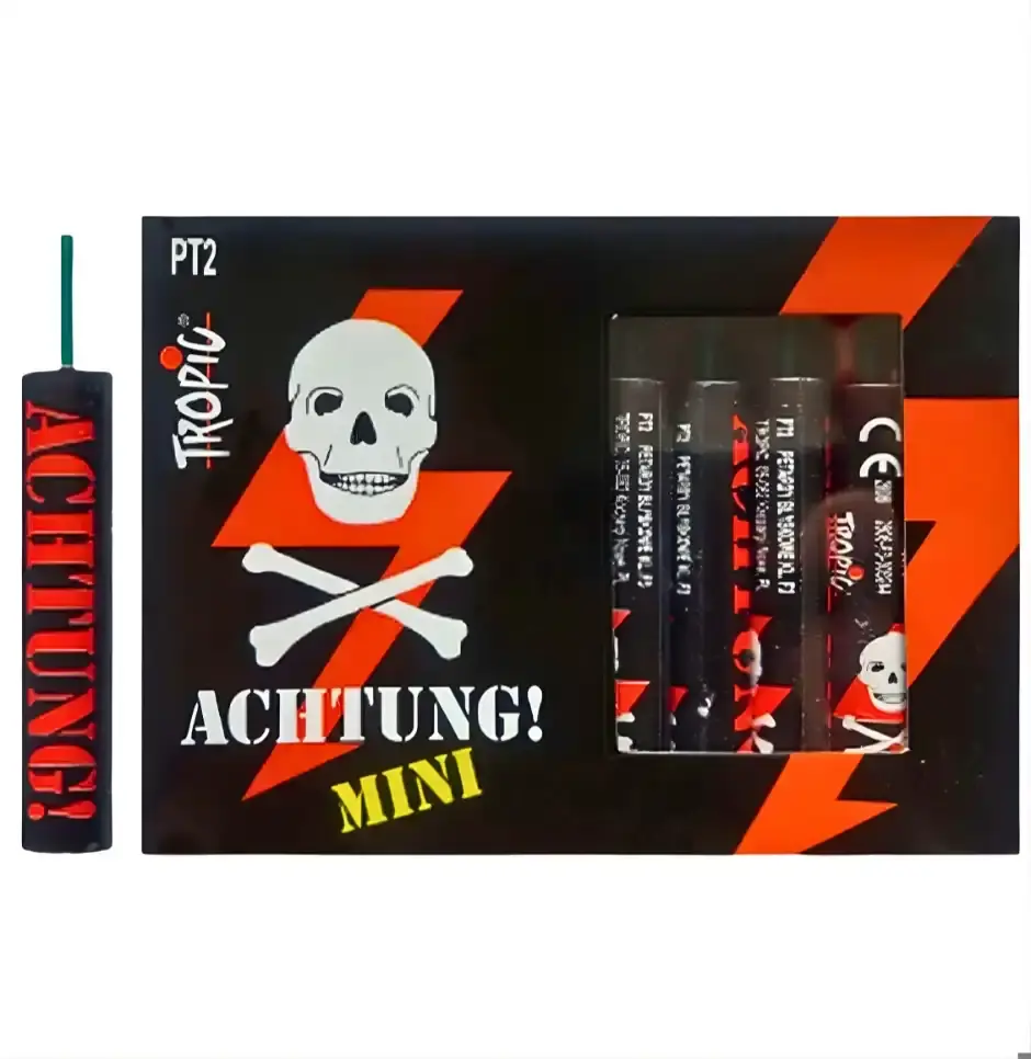 Петарды PT2 Mini Achtung от известного европейского бренда Tropic — это стильная и компактная серия с уверенным хлопком и быстрой работой фитиля. Несмотря на небольшой размер, каждая петарда выдаёт чёткий, резкий звук, который хорошо слышен даже на открытых площадках.