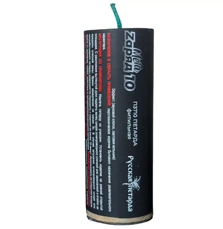 Петарда П3710 Мега Заряд 10 от бренда Русская Петарда — это идеальный вариант для тех, кто любит мощный звук, но предпочитает поштучный формат покупки. В каждом экземпляре — 16 граммов флеш-состава, обеспечивающего яркую вспышку и звонкий хлопок, сравнимый с классическими петардами Корсар-10.