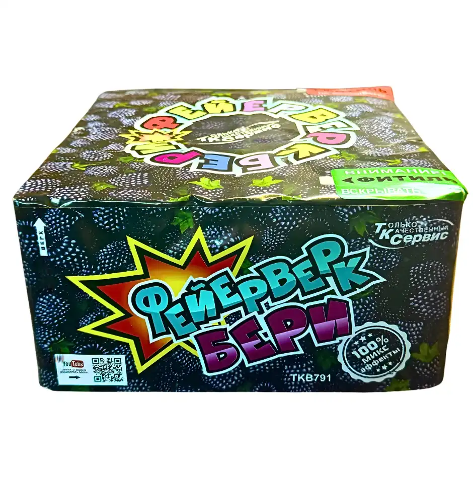 Батарея салютов TKB791 «Ежевика» от бренда «ТК Сервис» — это самая насыщенная модель в серии «Фейерверкбери». За ~45 секунд она выпускает 100 выстрелов калибра 16 мм, создавая эффект непрерывного огневого потока с высокой плотностью залпов.
