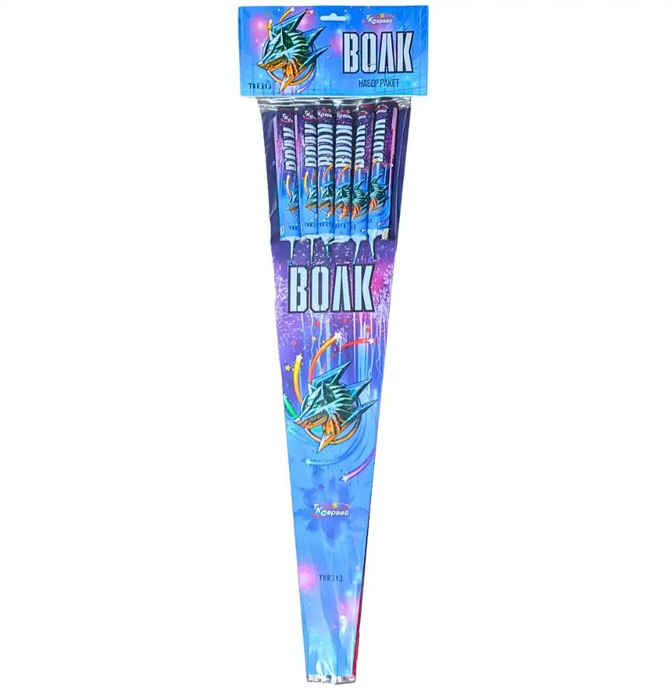 TKR313 Волк от ТК Сервис — это набор из 6 ракет, сочетающих энергию, динамику и красоту полёта. При запуске каждая ракета взлетает с громким, пронзительным свистом и завершается ярким взрывом с треском и россыпью искр. Это идеальный выбор для тех, кто хочет увидеть классический эффект ракеты в его лучшем исполнении.